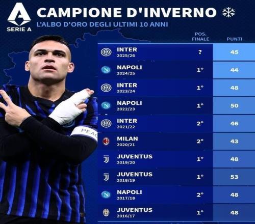 2016/17賽季,意甲半程冠軍尤文圖斯(半程48分,最終第1);2017/18賽季,意甲半程冠軍那不勒斯(半程48分,最終第2);2018/19賽季,意甲半程冠軍尤文圖斯(半程53分,最終第1);2019/20賽季,意甲半程冠軍尤文圖斯(半程48分,最終第1);2020/21賽季,意甲半程冠軍AC米蘭(半程43分,最終第2);2021/22賽季,意甲半程冠軍國(guó)際米蘭(半程46分,最終第2);2022/23賽季,意甲半程冠軍那不勒斯(半程50分,最終第1);2023/24賽季:國(guó)際米蘭(半程48分,最終第1);2024/25賽季,意甲半程冠軍那不勒斯(半程44分,最終第1);本賽季國(guó)米46分拿到半程冠軍,藍(lán)黑軍團(tuán)能否笑道最后,還有18輪比賽就能揭曉答案。