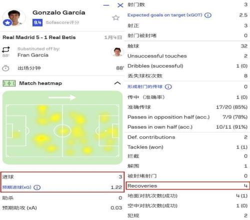 這一點(diǎn)從熱圖上也可以看到,貢薩洛的覆蓋范圍還是很大的。考慮到他不是那種持球型,這個(gè)熱圖本身還無(wú)法體現(xiàn)出他單場(chǎng)跑動(dòng)超過(guò)11000米的特點(diǎn)。