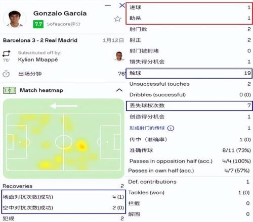 與巴薩的西超杯決賽上,貢薩洛6次一對(duì)一對(duì)抗輸了5次,僅僅只有19次觸球就丟球權(quán)7次,這樣的數(shù)據(jù)也充分說(shuō)明了他的問(wèn)題。