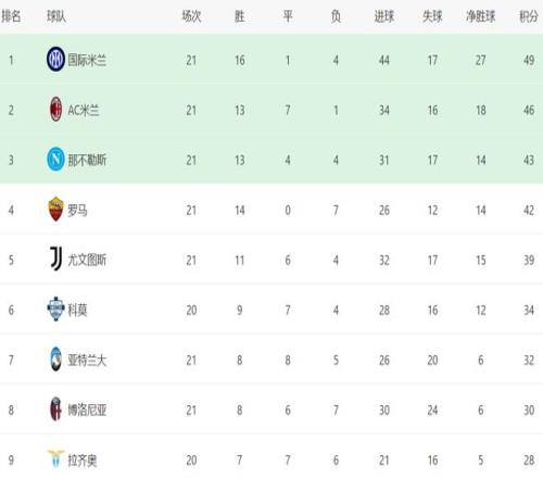 在積分榜上,國(guó)際米蘭依然高居榜首,總積分是49分。而AC米蘭贏球之后,總積分達(dá)到46分,排名第2,只比國(guó)際米蘭少3分。衛(wèi)冕冠軍那不勒斯43分排名第3,依然有沖擊冠軍的希望。羅馬3連勝之后,殺入了歐冠區(qū),總積分42分排名第4。尤文圖斯則掉到了第5名的位置,總積分是39分。科莫少賽一場(chǎng),總積分是34分,排名第6。亞特蘭大32分排名第7。博洛尼亞30分排名第8。拉齊奧只拿到28分,排名第9。