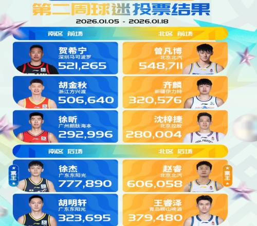 全明星第二周票數(shù)!徐杰趙睿票王,胡明軒反超龐崢麟,周琦被擠掉