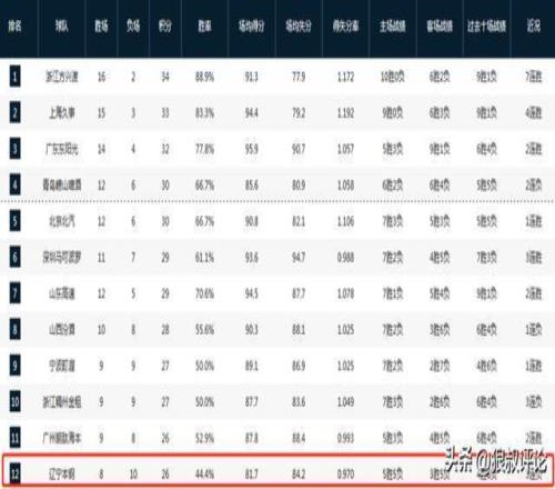 新賽季至今,遼寧取得8勝10負(fù)的戰(zhàn)績,跌至積分榜第12名。