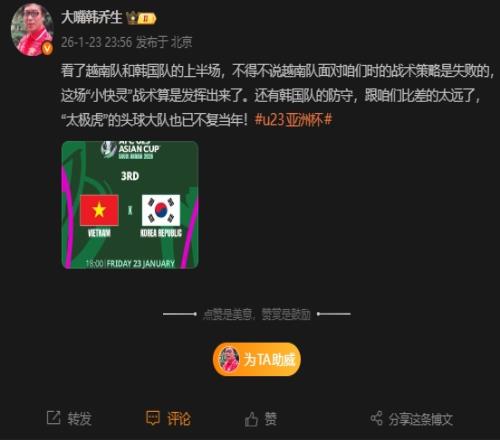 體育播報(bào)01月23日宣 2026年U23亞洲杯季軍賽越南U23vs韓國U23,目前半場戰(zhàn)罷,越南隊(duì)1-0領(lǐng)先,主持人韓喬生在社媒點(diǎn)評。