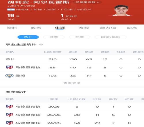 2024年夏窗,阿爾瓦雷斯以7500萬歐元的轉(zhuǎn)會費從曼城加盟馬競,至今85場40球13助,但來到馬競后尚未收獲一座俱樂部冠軍獎杯。目前25歲的阿爾瓦雷斯德轉(zhuǎn)身價為1億歐元,他與馬競的合同將在2030年6月到期。